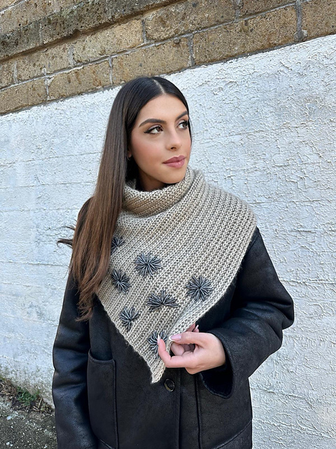 Il vero cuore di Bloom Shawl è il ricamo, appositamente rivisitato per adattarsi a un progetto che sia reversibile. Anche se non hai mai sperimentato questa tecnica, non lasciarti intimidire: è semplice, rilassante e altamente personalizzabile, perfetta per rendere ogni scialle davvero unico.