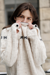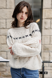 Inspired by the timeless style and elegance of Audrey Hepburn, the My Fair Lady Pullover combines a delicate colour work bow and a beautifully textured lace pattern for a classic sweater you'll want to wear over and over again.