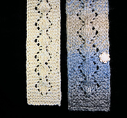 This skinny scarf (only 3 inches wide) can be worn in the popular lariat style, if desired. The pattern looked like a single chain of diamonds, hence the pattern name. I changed a few stitches of an 1892 Butterick insertion pattern to make this scarf. The pattern has only 13 stitches and 10 pattern rows. It’s not that difficult and, after a couple of repeats, you probably won’t need to refer to the instructions again!