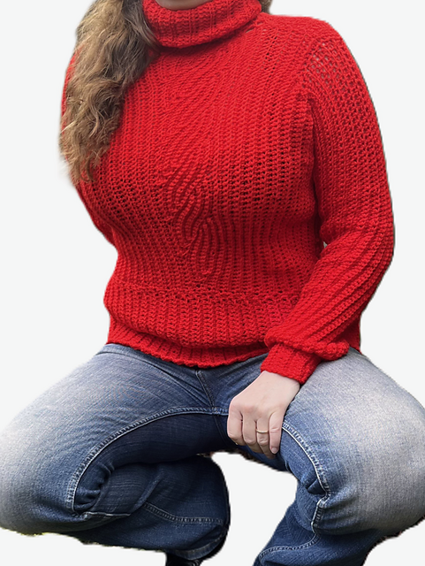 The 16-page pattern explains each step of the sweater row by row. Six electronically generated crochet charts supplement the instructions. The integrated cable pattern on the front is explained in detail with written instructions, crochet charts, and photos.