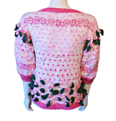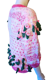 A Valentine's Day Cardigan for small size, with stranded colorwork and 3D flowers. Each flower is knitted and supplemented afterwards with a button & a crocheted leaf.