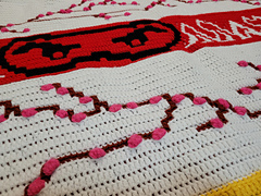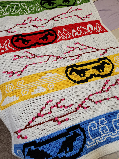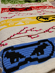 The blanket is thick and snuggly due to carrying colours behind. As such I recommend 600g aran weight yarn for the primary background, 200g aran weight yarn for the branches, 200g aran weight yarn for the cherry blossom, 300g aran weight yarn for the ninja masks and 100g aran weight yarn for each of the coloured stripes; although this is a rough guide and will depend on your tension. If you would like a thinner blanket I recommend switching to DK weight yarn.