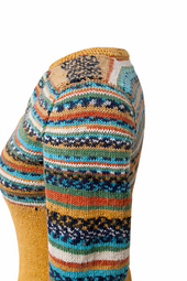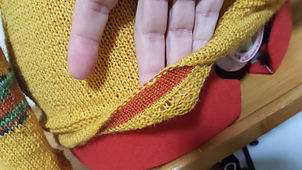 Self-striping yarn was introduced after shoulder short rows, creating a circular-yoke visual effect on a set-in sleeve structure