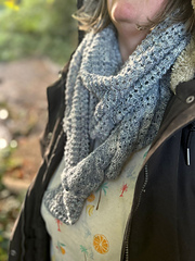 The shawl is a large shallow crescent which is easy to wear. The cowl has the same scooped edge as the shawl but a section of ribbing cinches it in at the back.