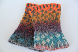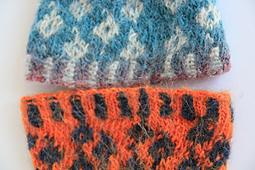 Die mit zwei Verlaufsgarnen gestrickten Pulswärmer im Leopardenmuster bestechen durch den schönen Farbverlauf in warmen Farben. Die Bündchen sind ebenfalls im Fair Isle Stil mit beiden Garnen im 2 rechts, 2 links-Muster gestrickt. Den Pfiff erhalten die Pulswärmer durch eine gezielte Teilverfilzung in der Mitte des Strickstücks. Ein Abenteuer, dies auszuprobieren. Es lohnt sich.