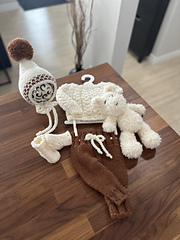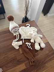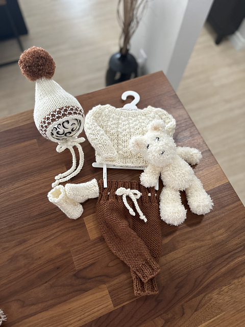 This is a downloadable PDF pattern for the knitting of this Nova 5 piece pullover sweater set. Set includes pullover sweater, pant bottoms, socks, pixie bonnet with pom-pom and snuggle bear in newborn/20-21 inch reborn size and NOT the actual finished items.