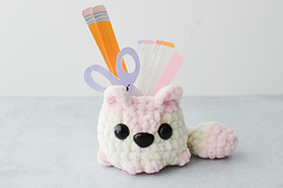 This advanced beginner/intermediate no-sew pattern is written in U.S. crochet terms, complete with clear instructions, pictures, and video tutorial to help you along the way. Fox Desk Buddy is crocheted in the round/continuous spirals without joining the rounds. I suggest using a stitch marker or different color yarn to keep track of each round. Fox Desk Buddy is crocheted in super bulky chenille yarn and is approximately 3 inches tall to the top of the ear and 2 inches tall to the top of the cup . Be aware that size may vary depending on the yarn and hook size used. Gauge is not particularly important, just be consistent with the tension you are using. And most importantly, have fun!