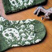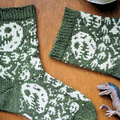 Ancient Imprints is a colourwork sock pattern inspired by fossils hidden deep within the earth. Set against a rich dark green background, dinosaur skulls, bones, and footprints are scattered across the fabric like ancient remains preserved in stone. The motifs repeat around the leg and foot, creating the impression of unearthed relics frozen in time.