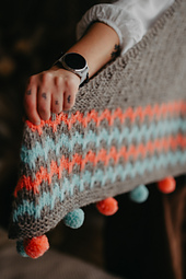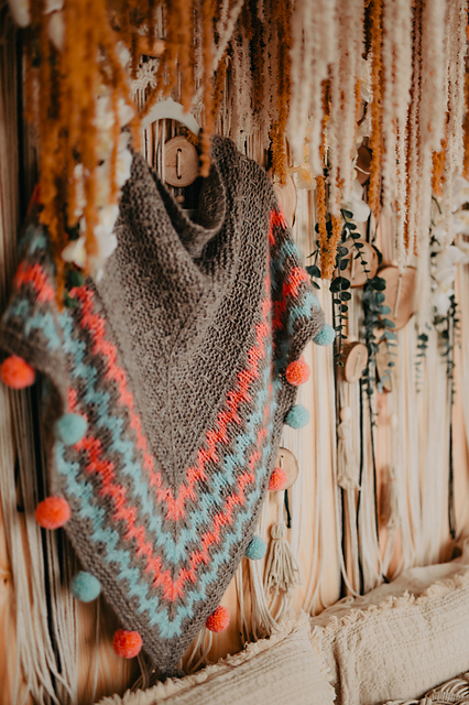 *Wrap yourself in a cozy embrace with the Snugglebug shawl! This delightful triangular design features a garter body with playful slipped stitches and vibrant slip-stitch patterning ideal for a splash of color. Adorned with charming, colorful pompoms along the edge, Snugglebug is a whimsical touch to any wardrobe, perfect for adding a dash of cheer to your day.*