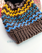 This beanie works beautifully with both solid yarn and cake/self-striping yarns to highlight the zig zag texture.