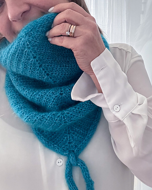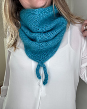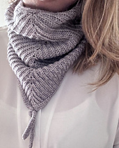 Worked in Half Fisherman’s Rib, it begins flat to shape the triangular front, then joins in the round for a comfortable, sculpted fit around the neck. An attached i-cord edging forms the signature ties and gives the piece a clean, structured finish.