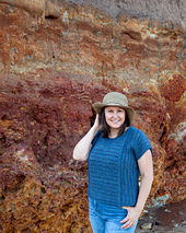 This top is knit with modular construction and seamed using 3-needle bind off and mattress stitch.