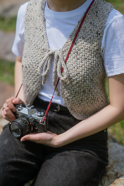 The Saddleback Vest body panels are worked flat bottom up and seamed together. The ties are made out of crochet i-cord and then seamed onto the front panels.