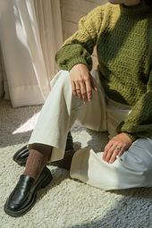 The Larch Sweater's stitch pattern is meant to look like a forest of larch trees. Panels and sleeves are worked from the bottom up separately. The body panels are then seamed together at the shoulders and the collar is directly crocheted onto the body panels. The sleeves are then sewn onto the body panels using mattress stitch. Then the sides of the panels and sleeves are seamed together. Last, the bottom ribbing and sleeve cuffs are directly crocheted onto the body panels and sleeves.
