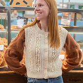 Pull et cardigan avec ou sans manches, réalisés en mini.B (100% pure laine peignée). Sur les devants et le long des manches, on s'amuse avec un jeu de torsades et de nopes. Le reste est tricoté en point de sable. les bordures d'emmanchures et d'encolure sont tricotées en côtes 1/1.