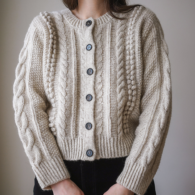 A modern yet classic cardigan defined by rich textures and elegant cable-work.