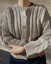 The saddle shoulders are worked first and feature a stockinette section that transitions into a striking cable, flowing seamlessly from the shoulder down the sleeve. The Back and Front are then worked by picking up stitches along the saddle shoulders.The central panel combines a series of fine, intricate cables and bobbles, adding depth and refinement. Designed with a traditional silhouette and a round neckline accented by a subtle decorative line, the Poppea cardigan balances classic sophistication with modern ease.