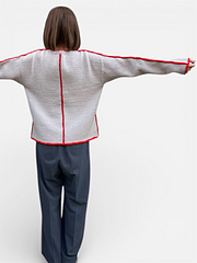 The lines running along the center back, sides, and from the shoulders to the sleeve ends create dimensional structure and visualy streamline the body.