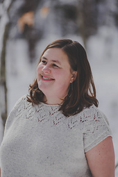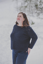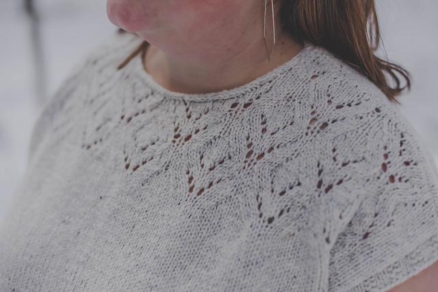 Body is worked in the round from the bottom up to the underarms, where fronts and backs are divided and stitches bound off at the underarm. Short rows are worked across the shoulders on front and back before bind-off. Shoulders are seamed and then stitches picked up for sleeves, which are worked from the shoulder to the wrist. Stitches are picked up around the neckline for ribbing. I suggest a stronger yarn like a sock yarn or yarn with nylon for seaming the shoulders.