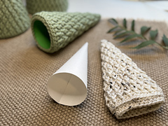 *Finished size: approximately 7.5” tall with a 3” base when the cone form is inserted (may vary with yarn and cone size).