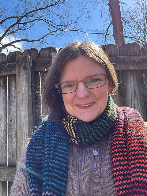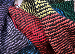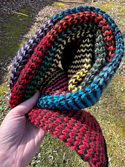 I used most of a skein of Big Twist as my "background" color and odd balls from stash in rainbow stripes for the second color. I changed color families every foot so the full scarf is 6 feet/1.8 meters long.