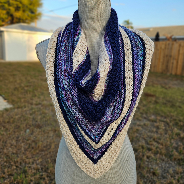 Breathing Room is a three-color dk weight bandana cowl that starts at the top center and is worked back and forth initially and then joined in the round.