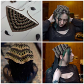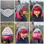 The first photo show my original Blooming Bandana. The remaining photos feature finished bandanas made by my pattern testers, showcasing different colors, yarns, and fits.