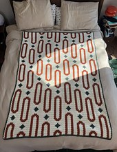 This pattern produces a blanket that is 43” (109cm) wide and 61” (155cm) long, and it has instructions to adjust for other possible sizes. It is worked row-by-row with color changes to create the ovular motifs.