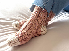 Perfect for lounging around the house, these lounge socks are soft and cozy with a slightly relaxed fit. The sock works up quickly and can be made in three women’s sizes: Small (5 - 6.5), Medium (7 - 9.5), and Large (10 - 11). The pattern includes a full YouTube tutorial for making the Women's Medium size which will fit a shoe size of 7 - 9.5. The sock is worked in the round from the toe up which makes it very easy to try on as you go and adjust the length as needed.