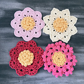 Meterage, hook size and final measurement will vary depending on your yarn choice. My samples are 14cm across, made from Bendigo Woollen Mills 8ply cotton and 3.75 mm hook. The meterage used was approximately
