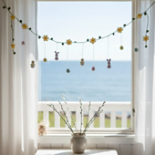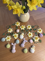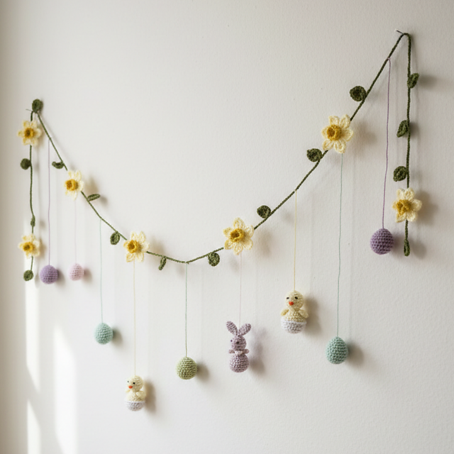 The garland features a delicate leafy garland adorned with crocheted Easter eggs, daffodils, small Easter bunnies, and mini chicks. All elements are designed to complement each other and create a calm, cohesive look – perfect for anyone who loves handmade Easter décor with a warm and personal touch.
