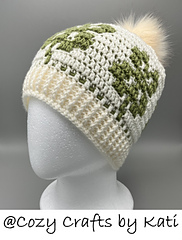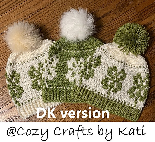 The DK version (this one) takes a bit longer to make compared to the Worsted version, and it results in a thinner fabric with smaller, more delicate motifs. Sizing is slightly different for the two versions, due to differences in gauge.