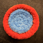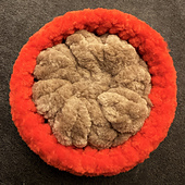 Yarnsmith chenille chunky yarn for the bowl and food inserts. 4mm hook. Yarnsmith cotton dk yarn for the toy bone with a 3mm hook.