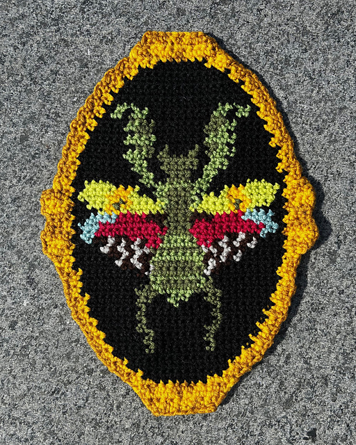 Tags: witch, halloween, patch, dark academia, whimsical, display, oddities, crochet tapestry, cutout tapestry, mantids, insect, jewel flower mantis