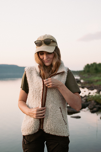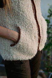 back neck. The upper back is worked flat to the underarms. The upper front sts are picked up along the shoulders and worked flat with neckline shaping down to the underarms. The pieces are then joined and the body is worked flat to the hem. The collar is worked in stockinette stitch, folded double and sewn to the inside. The vest is finished with I-cord edgings, a zipper, and pockets.