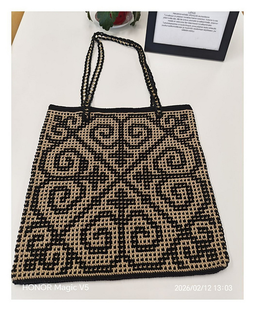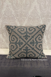 Sharshy Qoshqar Muyiz is a modular mosaic crochet design based on a traditional Kazakh square composition of the Qoshqar Muyiz ornament.