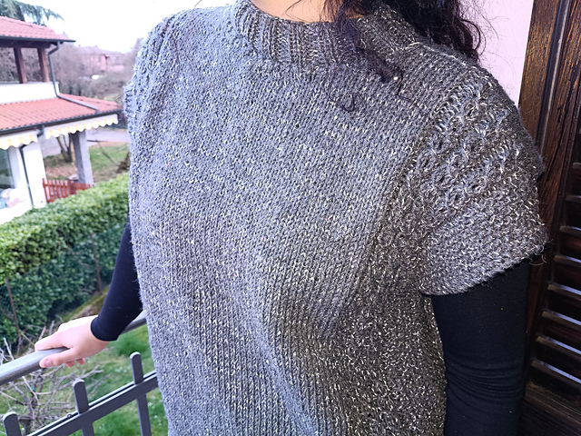 il gilet twist è lavorato a pannelli, il collo viene ripreso con l'utilizzo dei ferri circolari.