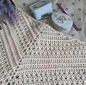 This triangular shawl is crocheted using different stitch patterns that create a textured fabric. Worked in soft merino wool, it is warm and comfortable, perfect for winter. The cream color makes it a versatile accessory, easy to combine with different outfits. It is beginner-intermediate friendly.