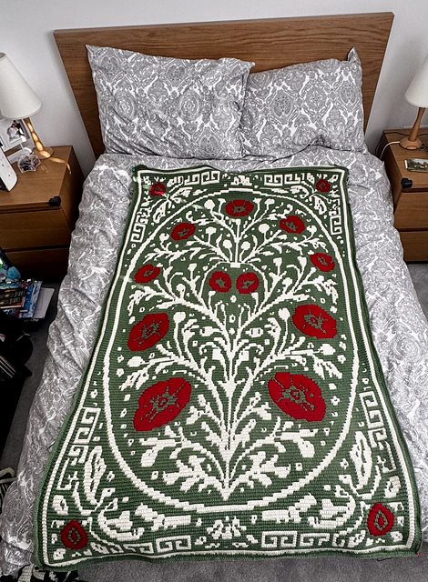 Though visually impressive, the mosaic overlay technique is worked primarily using one colour per row, creating bold colourwork that is methodical, rhythmic, and deeply satisfying to crochet. This design also incorporates a third colour for the poppies, worked using the Tapestry Method. Built row by row, the image gradually emerges — making this an engaging project for confident crocheters who enjoy structured, rewarding makes.