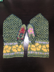 This project makes 2 Norwegian-style colorwork mittens and is intended for a knitter with experience enough to work from and modify a chart with minimal instructions that uses more than two colors in a single row. **If made as shown, some rows will contain up to five colors on the front.** Alternatively, you can embroider the accent colors on the columbines using a duplicate stitch to avoid using so many colors per row.