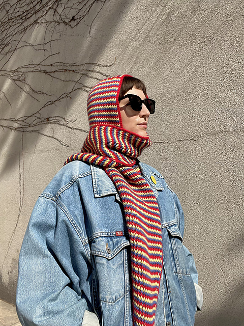 This Tunisian crochet hood pattern creates a cozy knit-look scoodie using seamless join-as-you-go construction. Designed for intermediate crocheters, this hooded scarf can be made striped or solid and works up beautifully in worsted weight yarn for a modern winter accessory. Plus the Huddle Up Hood functions as a stylish alternative to a beanie or balaclava.