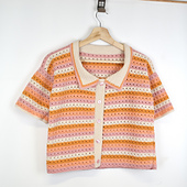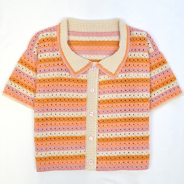 This striped crochet top pattern features a lightweight openwork design, short sleeves, a classic collar, and a fully buttoned front —