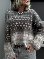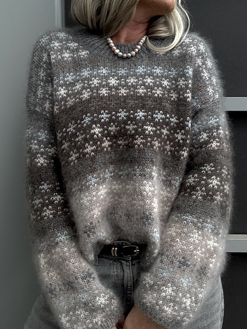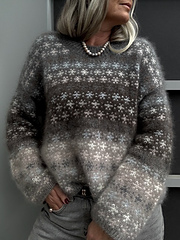 The entire sweater is worked in color pattern. Begin with the back, which is first worked back and forth with short rows at the neck to shape the shoulders. Then pick up and knit stitches along the left shoulder and shape the front on that side. Next do the same on the right front, just mirrored, and when the neckline shaping is finished, cast on stitches at center front. Join the work to work in the round in color pattern for the remainder of the body. Finish with a rib edge. The neckband is worked in rib pattern. Stitches for the sleeves are picked up and knitted along the armhole edge, work color pattern in the round, and finish with a rib edge.