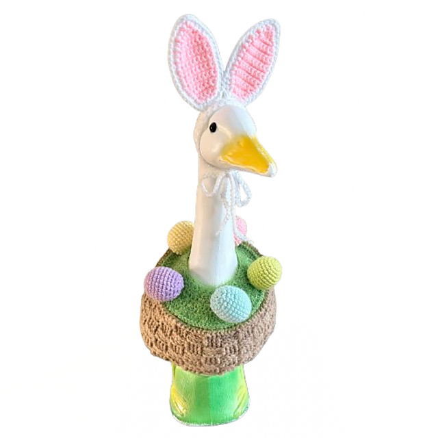 This festive “Easter Basket” outfit for your porch goose will fit a goose that is 23-28” tall. Extra rows can be added to the bottom to obtain desired length for a larger goose.
