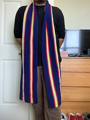 We're going back to the 60's with this crochet pattern! This scarf is based on university scarves that are only offered in English institutions for what major you have. Most English college scarves are made on Saxony Wool that are about 6 feet long with an 9 inch width. They originated from World War 2 when there was a scarcity of fabric material, they were able to get strips of wool and sewn them together to create a gratifying scarf to wear. They were very popular during the 60's since they were a fashion statement at the time and mine is based on Ringo's scarf in The Beatles: Get Back, but they did have other vibrant colors that were favored more. This groovy scarf has dashes of red, grey, yellow, and A LOT of blue.
