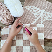 The Hercules Moth Tote was dreamed up by my 11-year-old, whose love for Melanie Martinez inspired every detail of this design. Bold and expressive, the front of the tote features a striking Hercules moth panel, while the back showcases a simple checkered design for a balanced, modern finish. Crocheted in white and dusty pink yarn, this tote is both eye-catching and versatile, perfect for holding books, sketchpads, crochet projects, or everyday essentials.