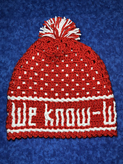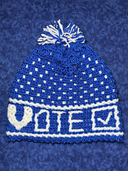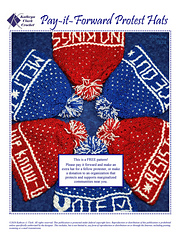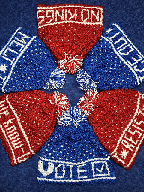 The Pay-it-Forward Protest Hats pattern has six different hat bands to choose from (Resist, No Kings, We Know What We Saw, Ice Out, Melt the Ice, and Vote✓), as well as a chart-your-own option. From the hat band up, the hat has two separate layers, one of each color, with a matching pom pom on top.