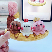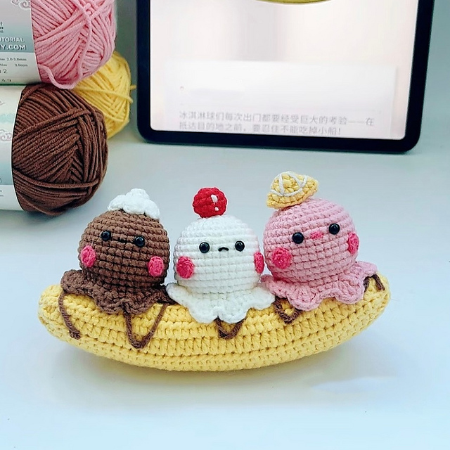 This cute crochet pattern features a banana boat topped with three ice cream scoops in different flavors, each with its own charming topping.