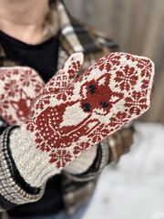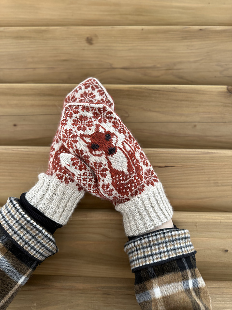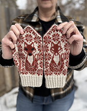 These mittens are knit with an Eyelet Mock Cable ribbed cuff and a thumb gusset. The eyes and nose can be added with duplicate stitch. This pattern includes directions and charts for 3 sizes: [7 (8, 9) inches/17.5 (20, 22.5) cm circumference]. To determine your size, measure around your knuckles and choose the size that gives you a small amount of positive ease.