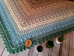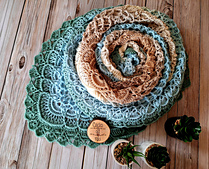 Chustę widoczną na pierwszych zdjęciach wykonałam z motka: kokonek Merino (kokonki.pl) w ilości 1720m, 3 nitki, szydełkiem 3,5 mm.